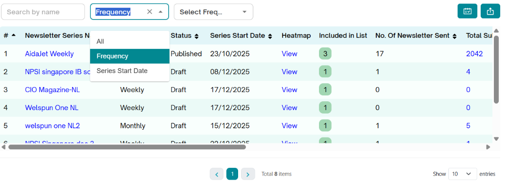 Search Bar- Lets you search newsletter series by Frequency and Series Start date.