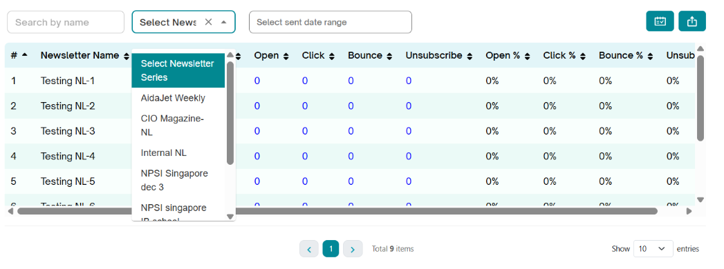 The Newsletter report page in AidaJet provides a structured overview of all your newsletter campaigns—summarizing their frequency, performance, and reach. Whether you're managing drafts or tracking delivery outcomes, this dashboard ensures clarity and ease in newsletter management.