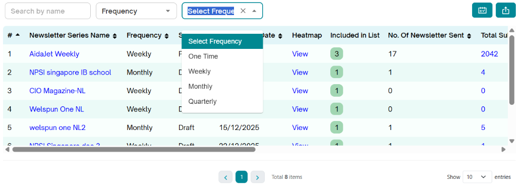 The Newsletter Series section displays a complete list of all created newsletter series, allowing users to monitor and evaluate campaign performance at a consolidated level.