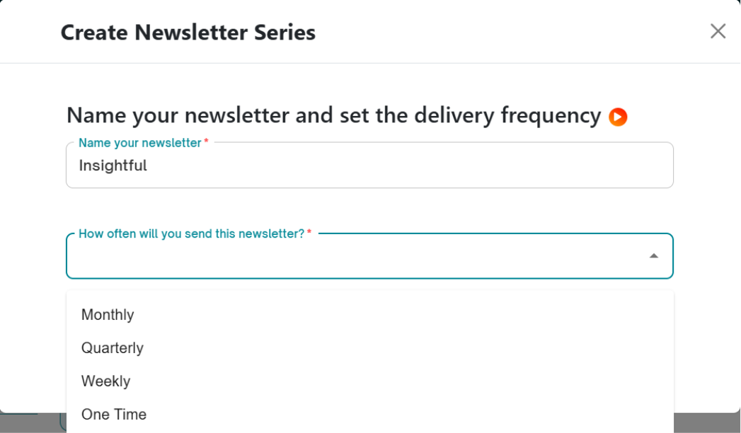 - Select the frequency – Choose from Quarterly, Weekly, Monthly, or One-time newsletters.