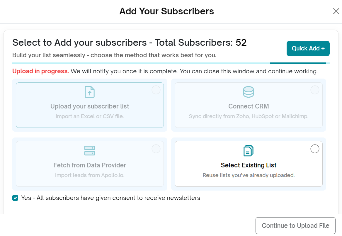 The Upload in Progress screen will appear while the email IDs are being verified for deliverability. You’ll receive a notification once the upload is complete and the emails have been added to your subscriber list.