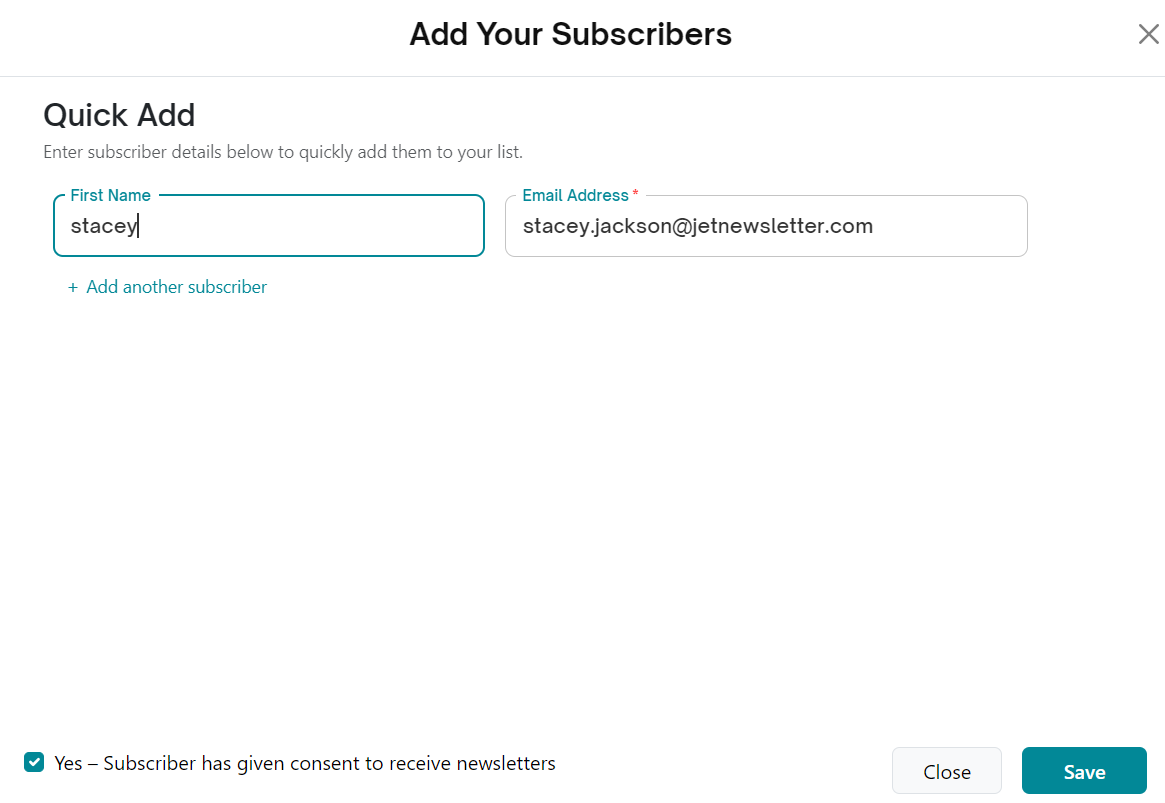 In some cases, you may want to add a subscriber you initially missed or include a team member to receive the newsletter. The Quick Add option allows you to add a subscriber instantly.