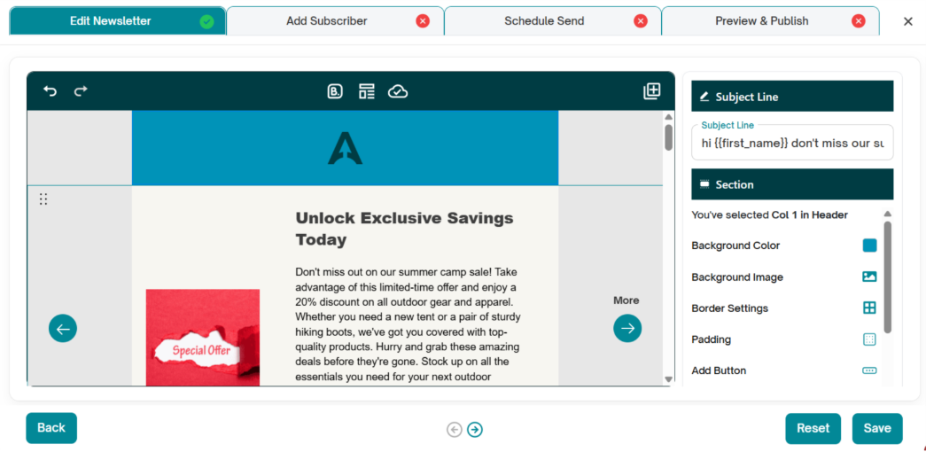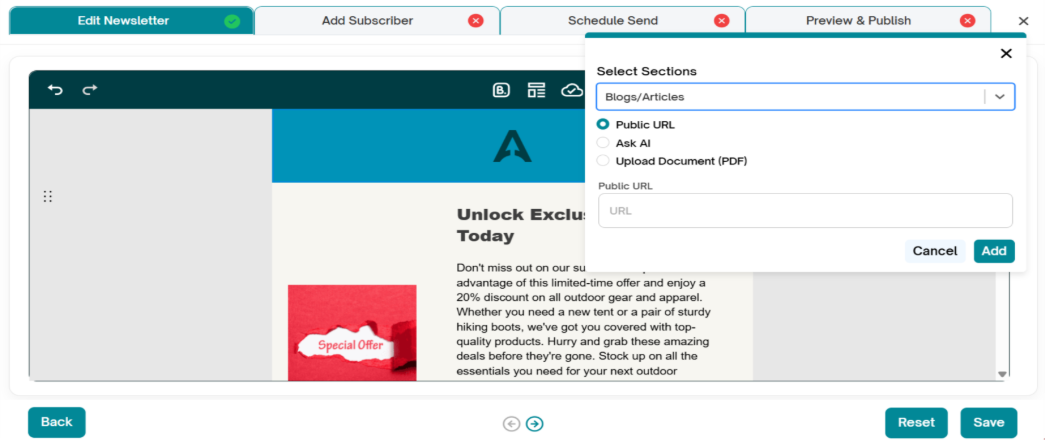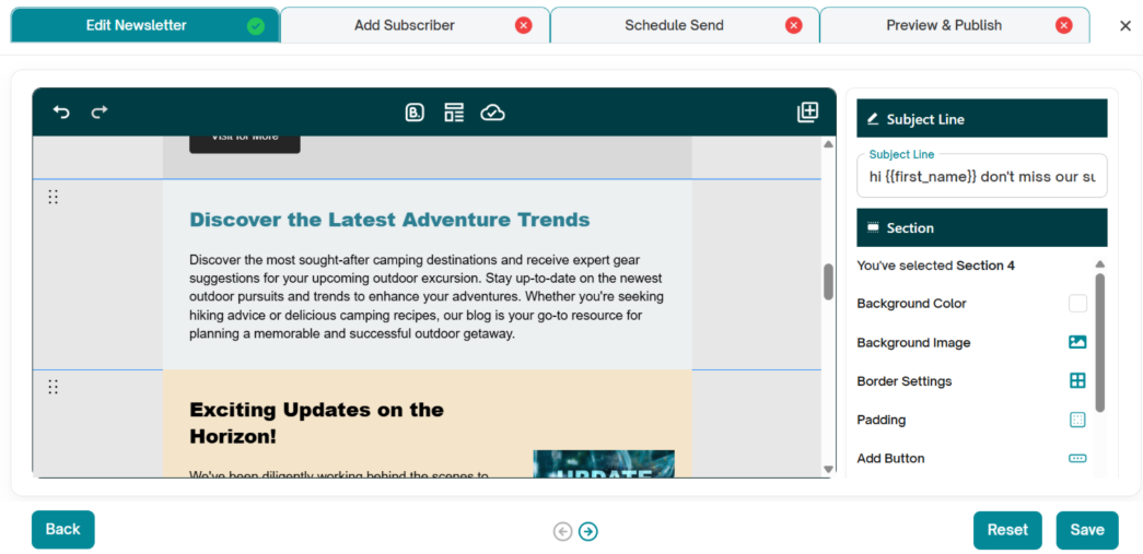 2. Add Section – In case you have missed adding a section while creating the newsletter, you can insert additional content sections as needed.