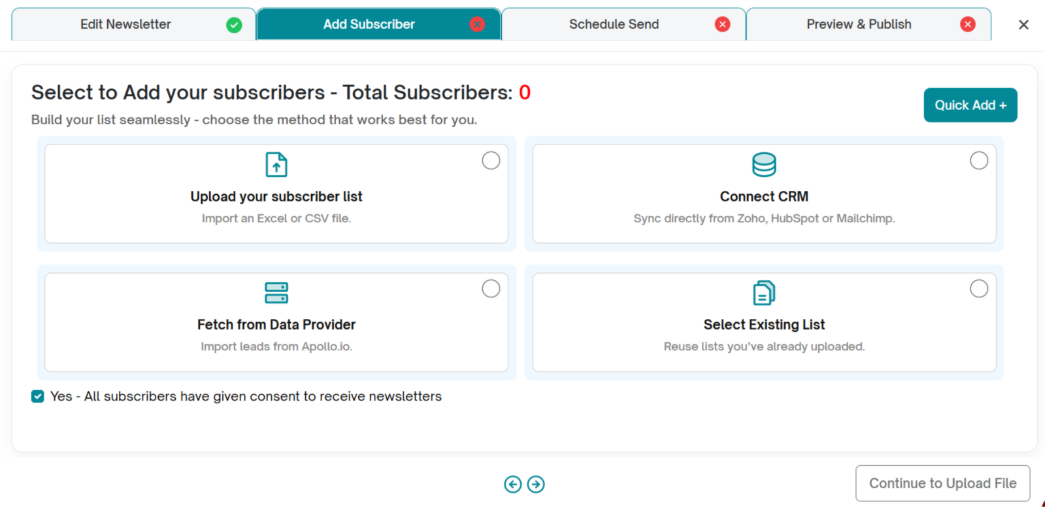 - Quick Add allows you to add individual subscribers quickly and easily by clicking on the quick add button.